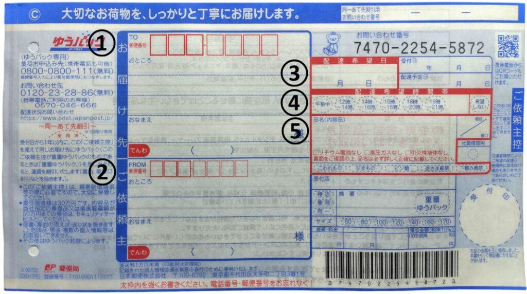 ①お届け先 ②ご依頼主 ③配達希望日 ④配達希望時間帯 ⑤品名