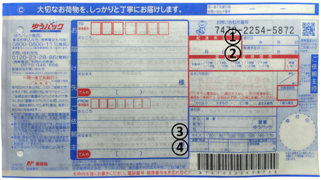①受付日 ②配達予定日 ③サイズ ④運賃 ※受付店などの記入はしなくても大丈夫です。