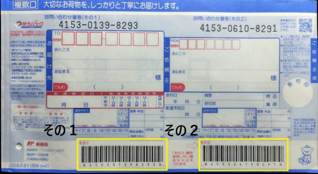複数口の伝票には2つのバーコード(その1・その2)があり、その1のバーコードから1個目の荷物をレジ登録します。