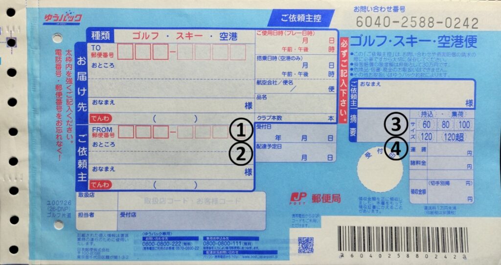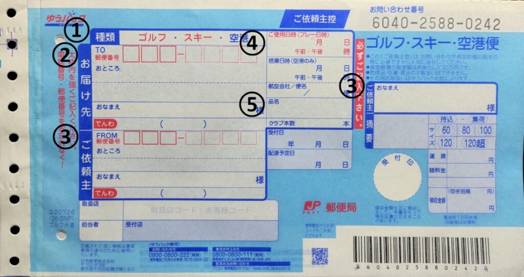 ①荷物の種類 ②お届け先 ③ご依頼主(2ヵ所) ④ご使用日時(プレー日時)、搭乗日時・航空会社/便名 ⑤品名(ゴルフクラブの本数)